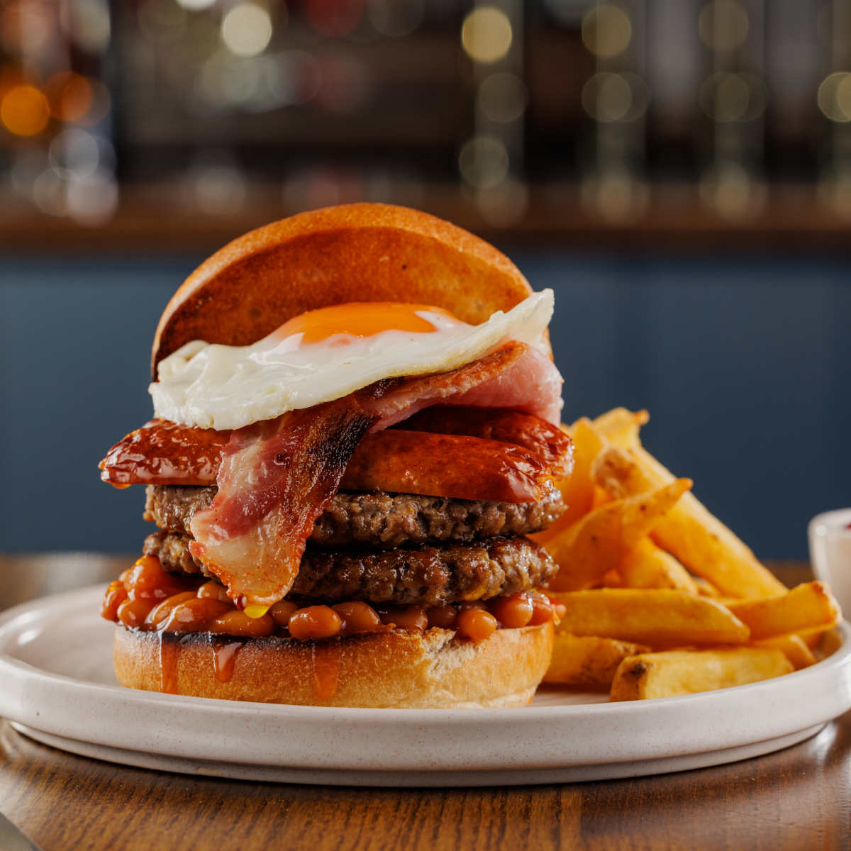 Traditional breakfast, pork sausages and bacon rashers served with a free-range fried egg, hash brown, mushrooms, tomato and baked beans | 9.49 1184 kcals